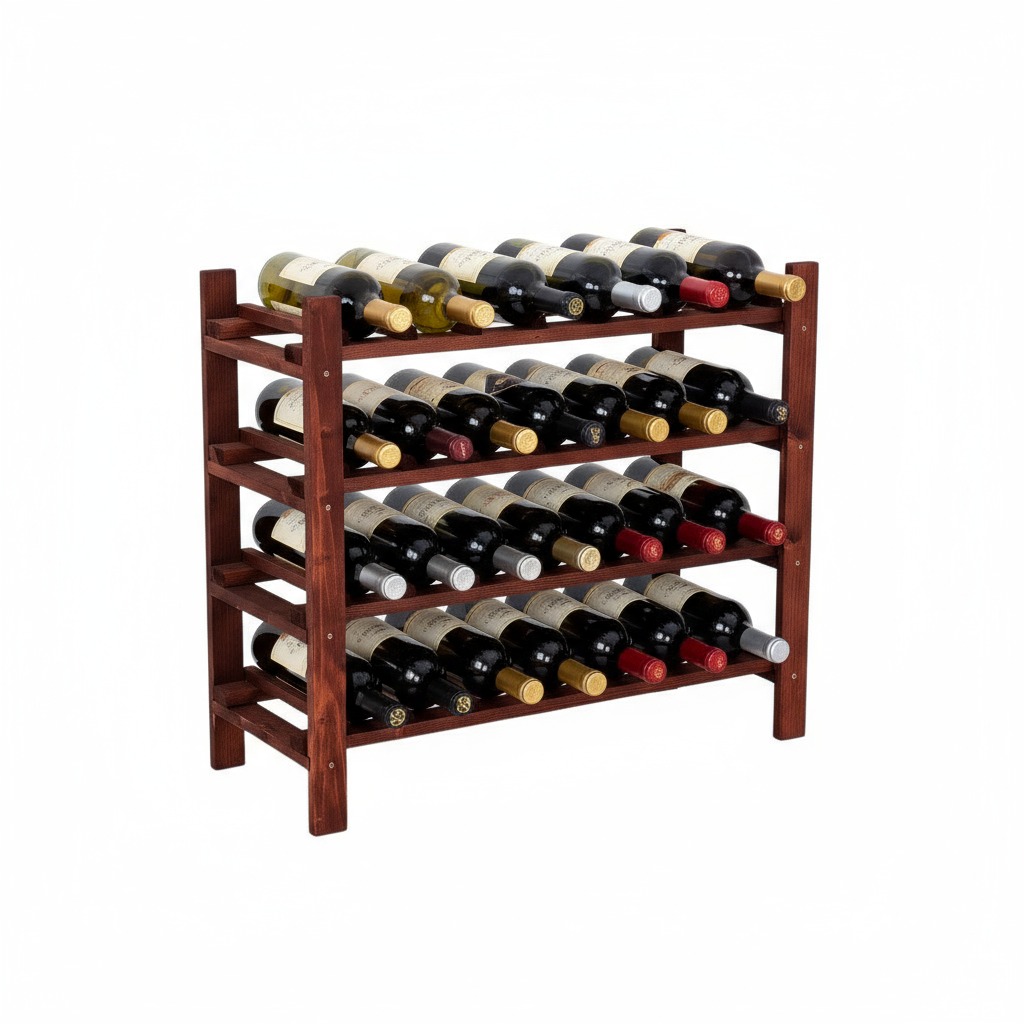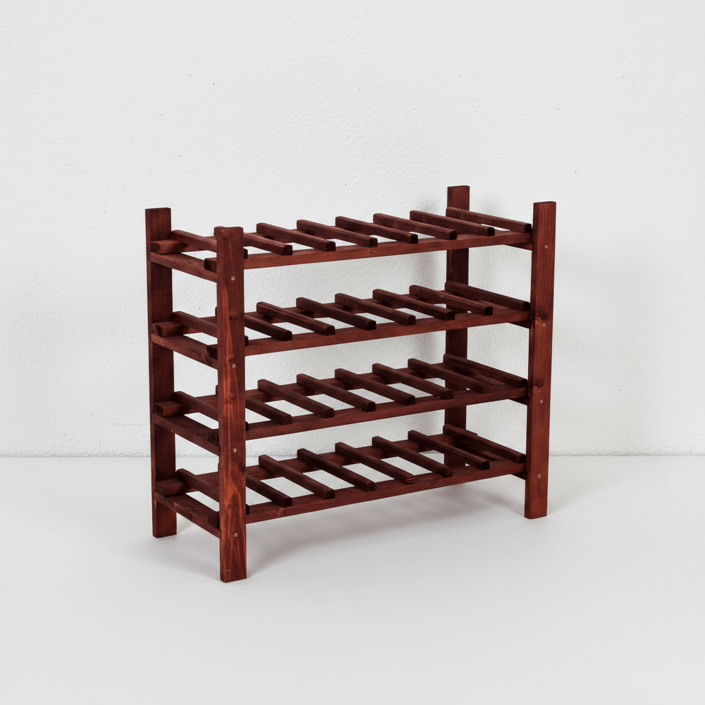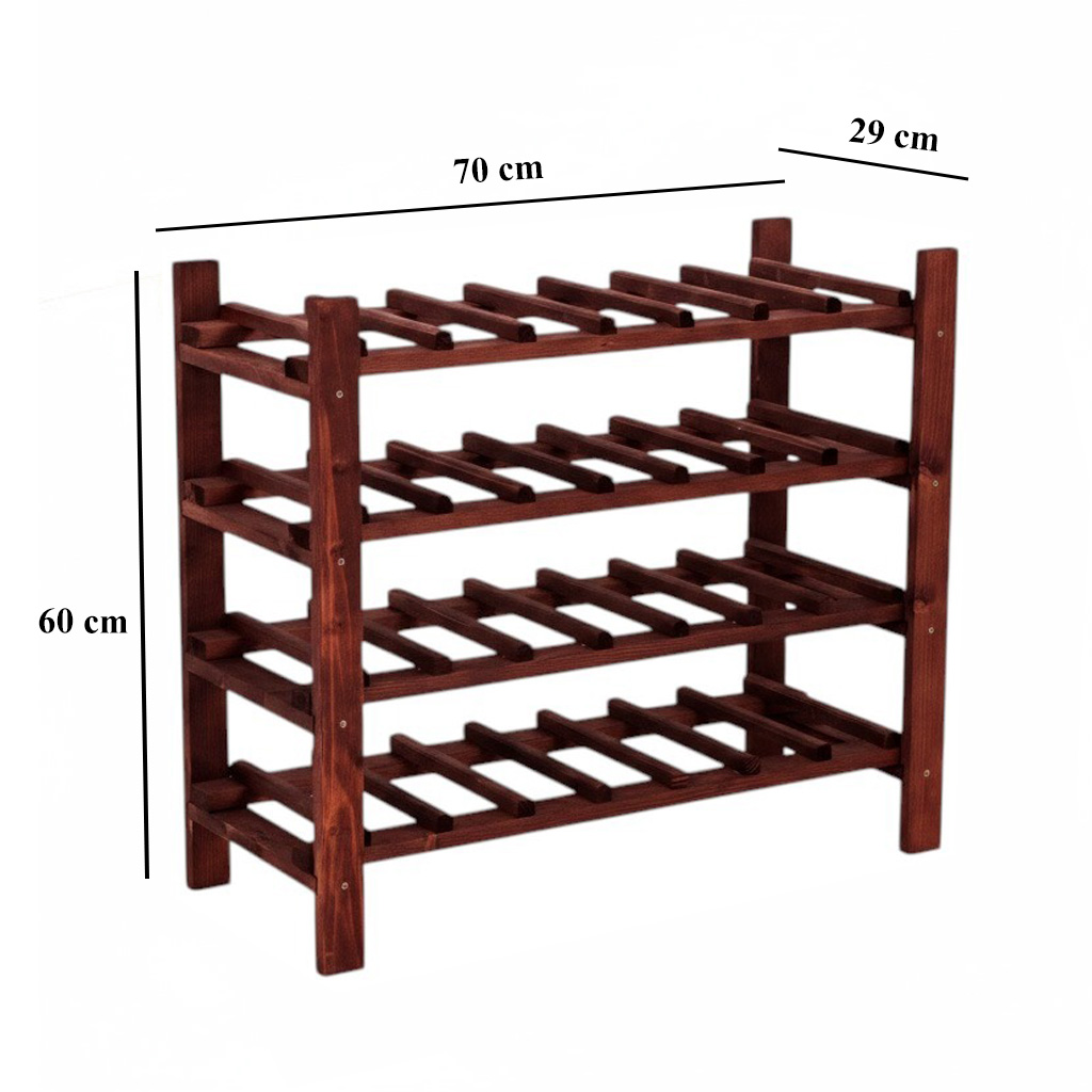 A fenyőfából készült borosüveg-tartó 4 polccal rendelkezik és 28 palack tárolására alkalas.