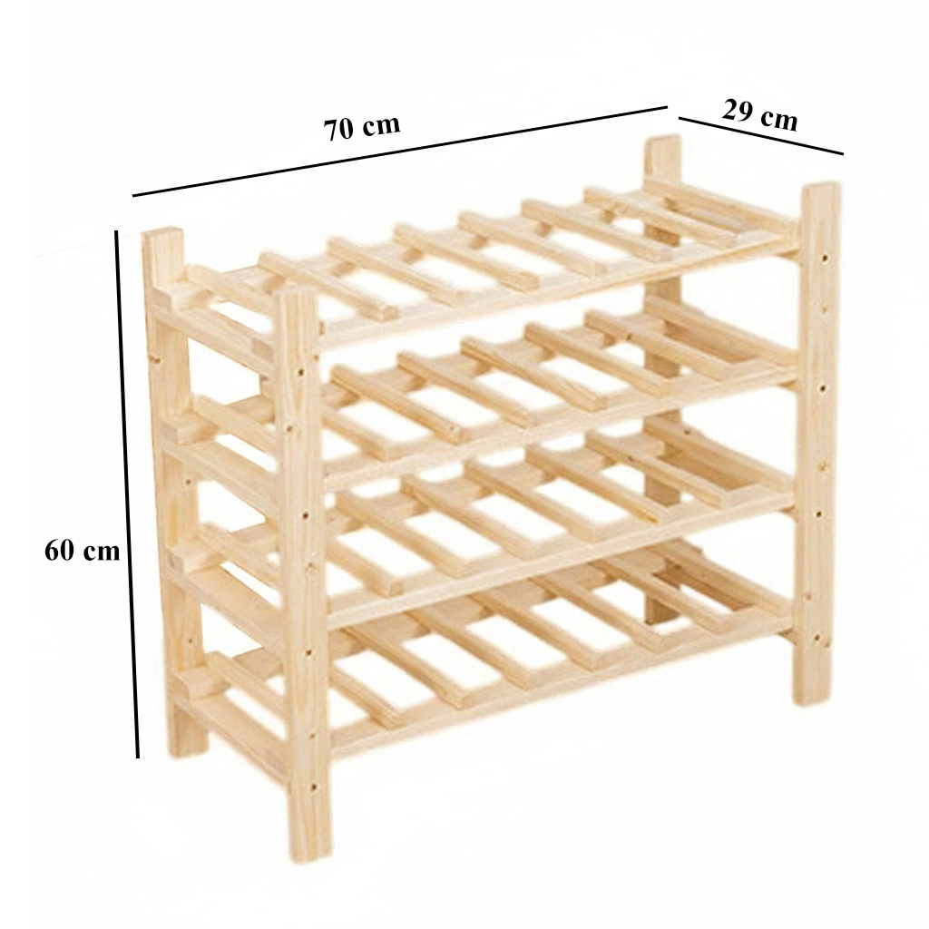 A fenyőfából készült borosüveg-tartó 4 polccal rendelkezik és 28 palack tárolására alkalas.