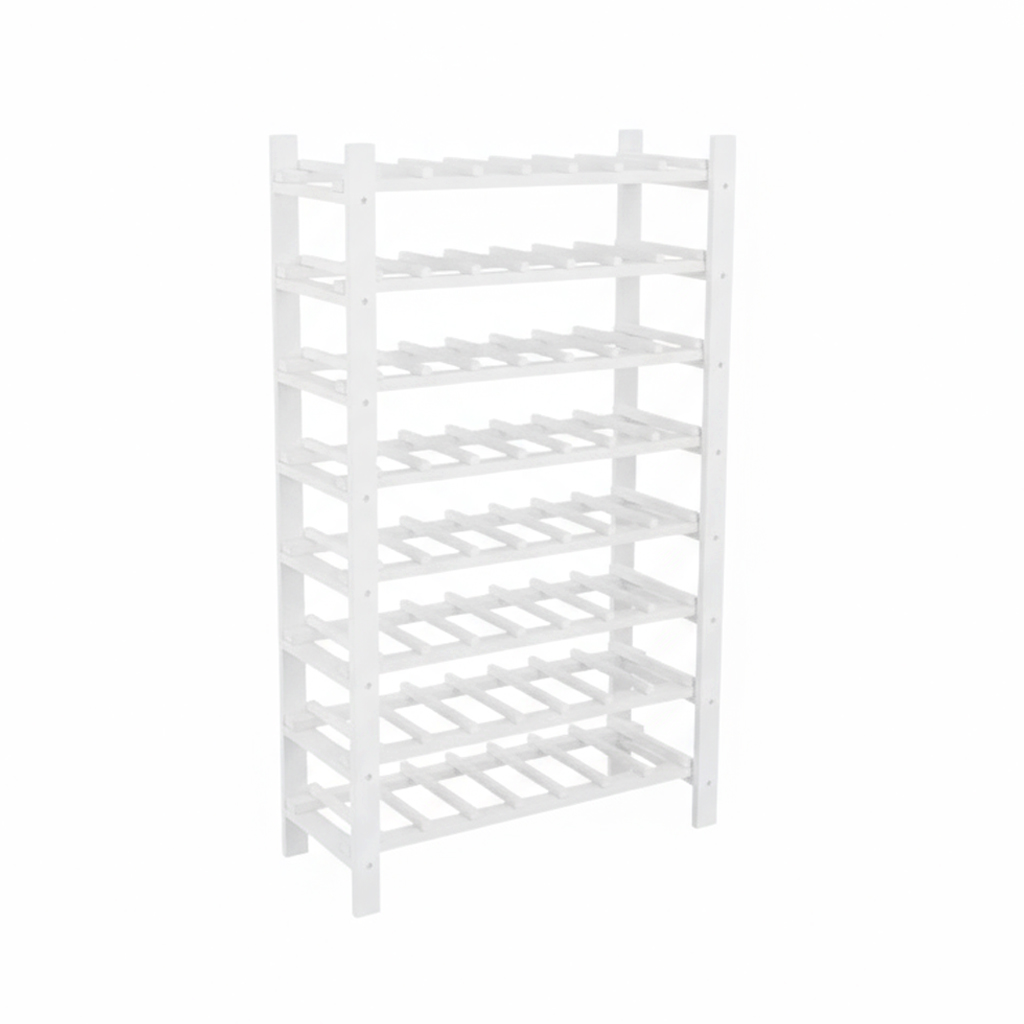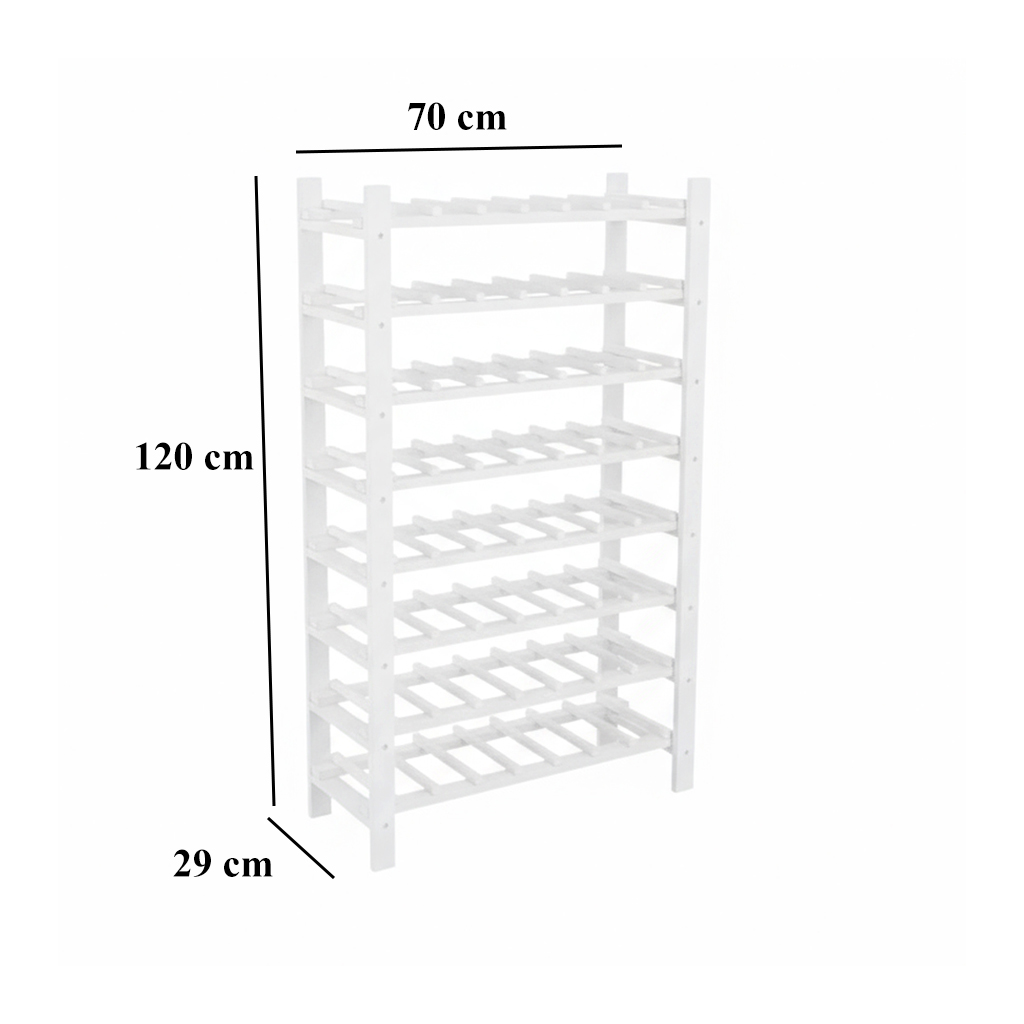 A fenyőfából készült borosüveg-tartó 8 polccal rendelkezik és 56 palack tárolására alkalas.