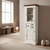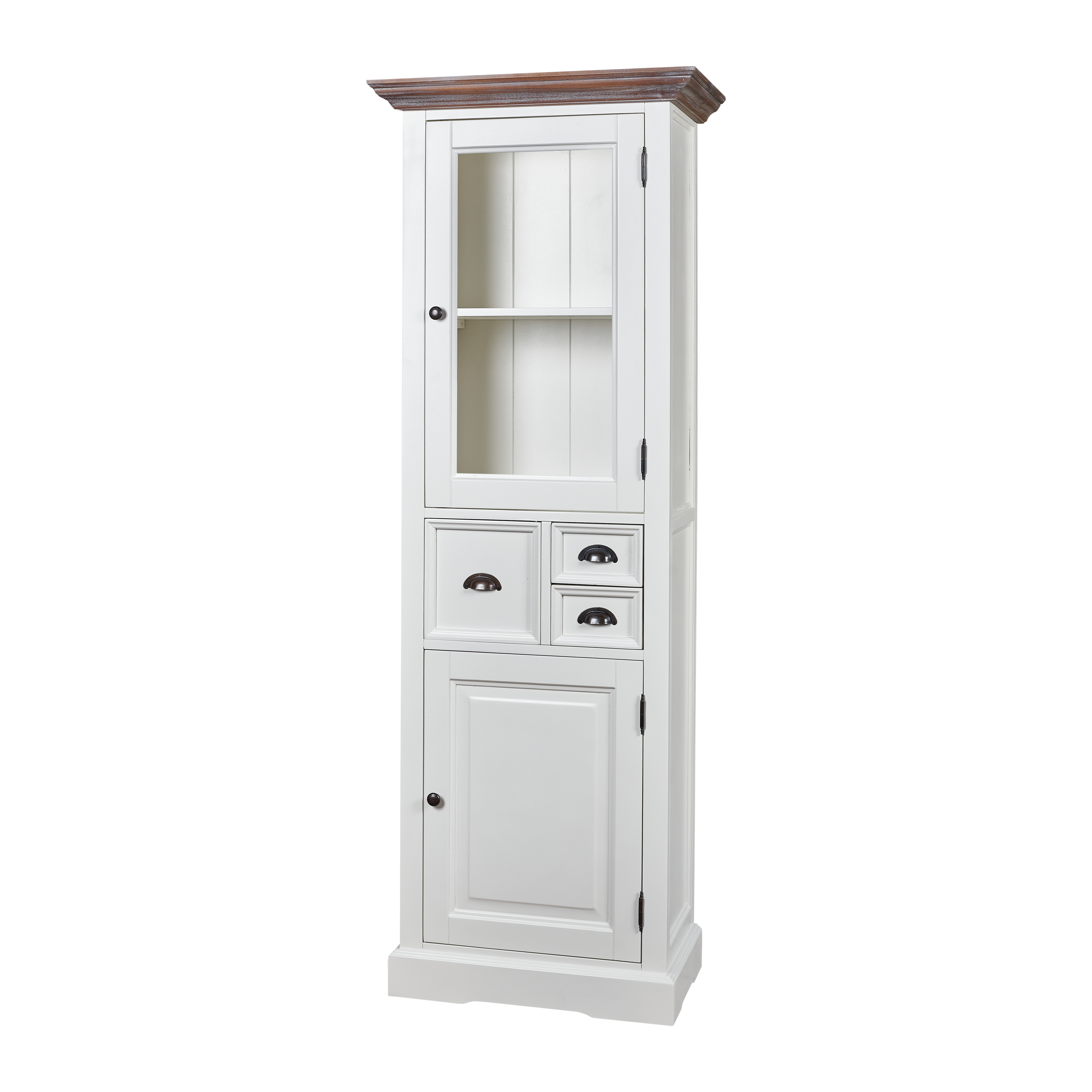 Corpul este finisat într-o nuanță alb-crem oferind luminozitate și senzație de spațiu, în timp ce partea superioară este accentuată de o cornișă din lemn de tei cu finisaj antichizat, care adaugă un contrast elegant și autentic.