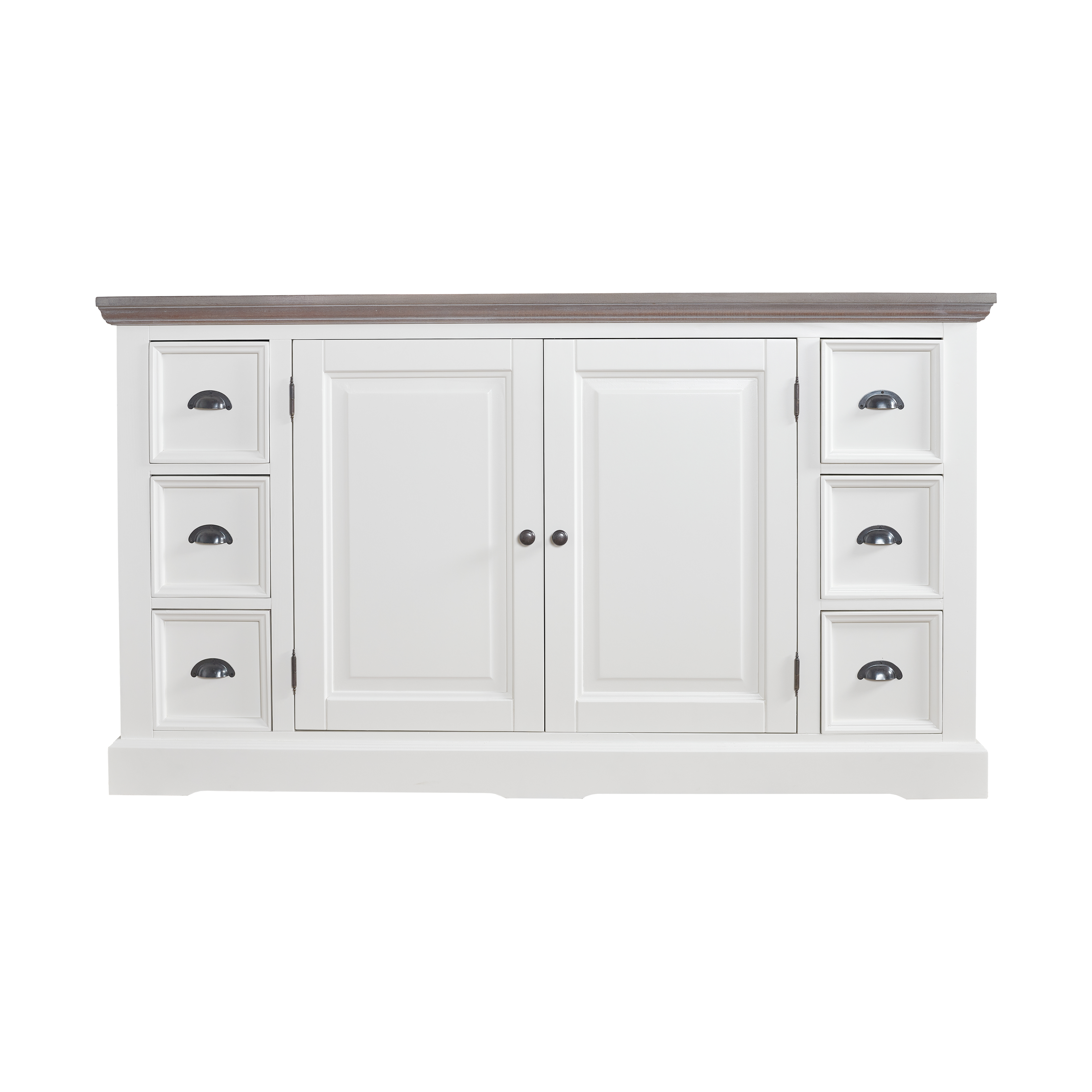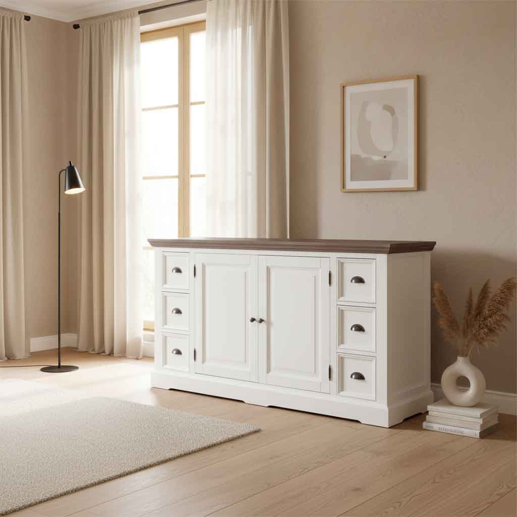 Bufet Monaco Collection, Transilvan, 2 Usi, 6 Sertare, MDF si Lemn Masiv, 160x50x90 cm, Alb si Lemn Tei