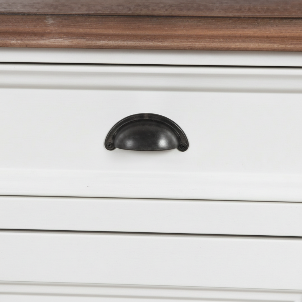 • 5 sertare superioare de dimensiuni variate (trei late și două înguste), ideale pentru tacâmuri, documente sau accesorii