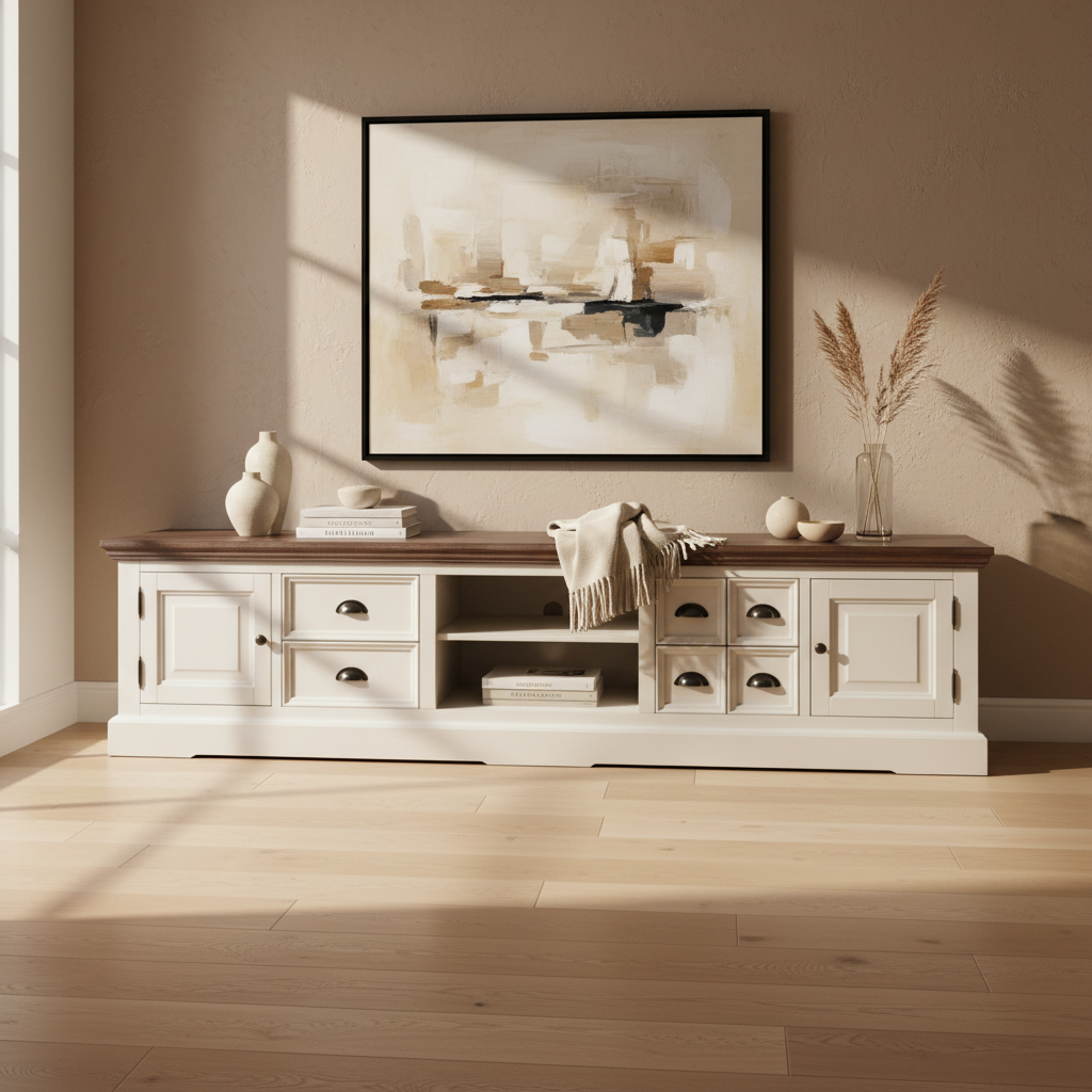Comodă TV din lemn masiv și MDF 220 cm – spațiu generos, design elegant și funcționalitate media completă