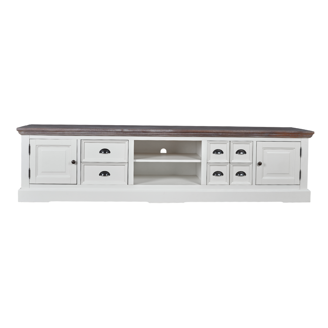 Comodă TV Monaco Collection, Transilvan, 2 Uși, 6 Sertare, MDF și Lemn Masiv, 220×50×54 cm, Alb și Lemn Tei