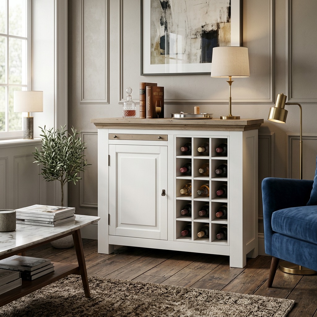 Comoda vin Verona Collection, Transilvan, în dimensiunea 104×40×90 cm, este o piesă de mobilier premium concepută pentru a oferi organizare eficientă, eleganță rafinată și funcționalitate inteligentă în orice living sau zonă de dining. Această piesă îmbină armonios estetica stilului farmhouse modern cu utilitatea practică, devenind alegerea ideală pentru pasionații de vin și pentru interioarele atent amenajate.