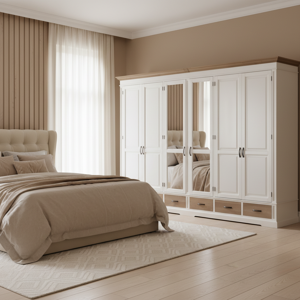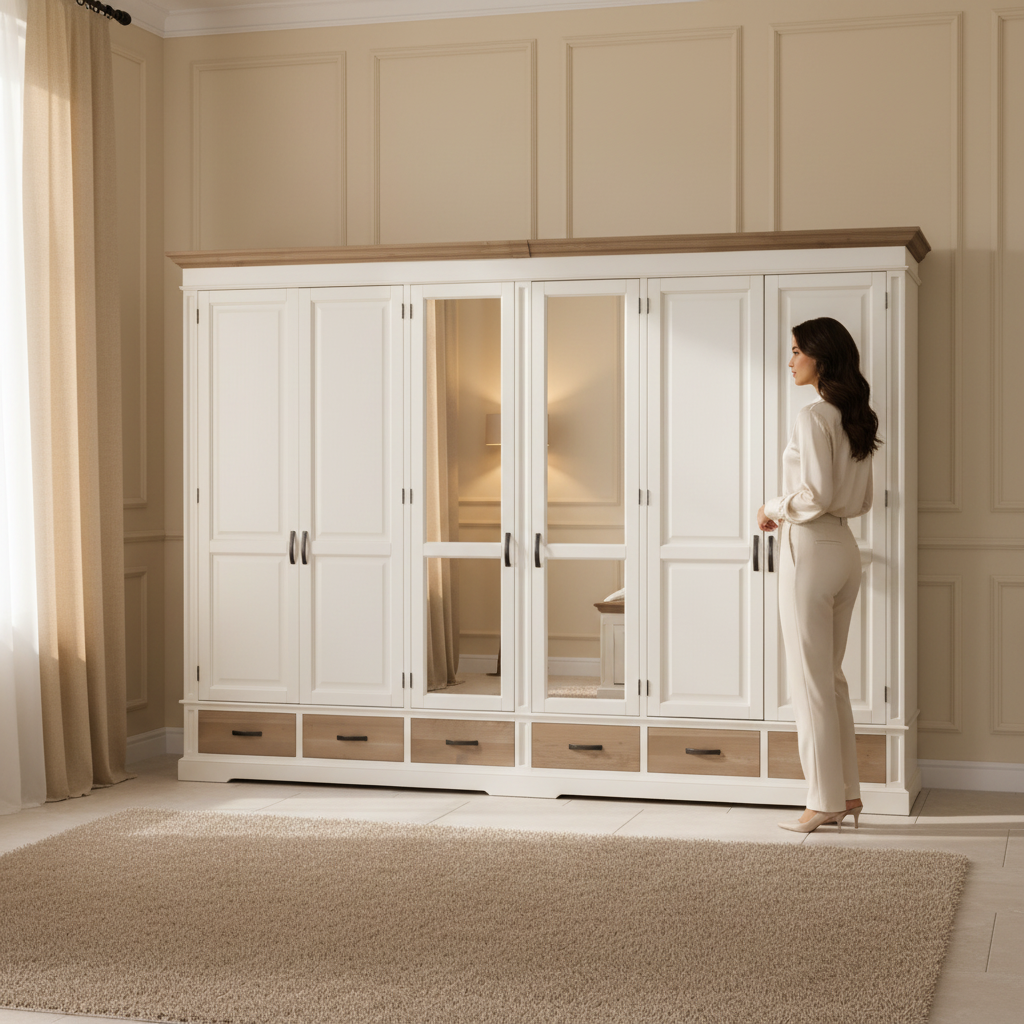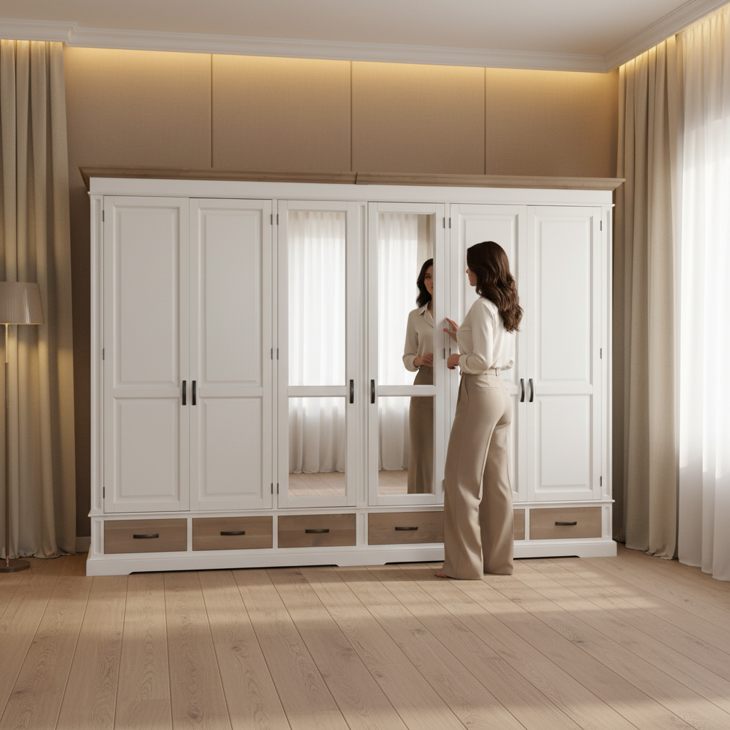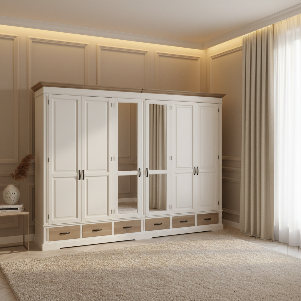 Dulapul impresionează prin dimensiunea sa generoasă și liniile sale echilibrate, fiind ideal pentru dormitoare spațioase. Cele 6 uși creează o structură simetrică și armonioasă, în timp ce oglinzile centrale adaugă un plus de funcționalitate și eleganță.