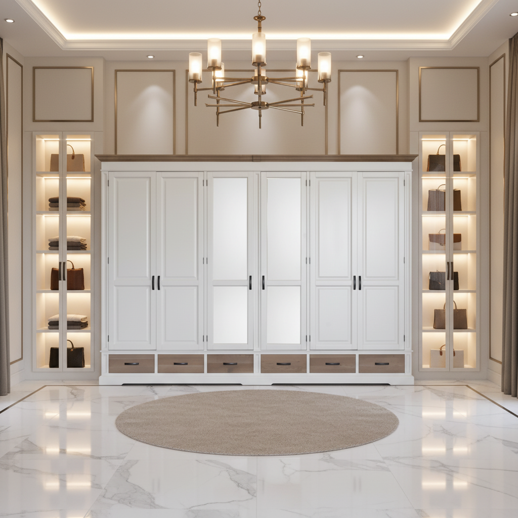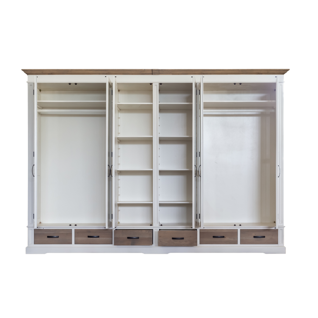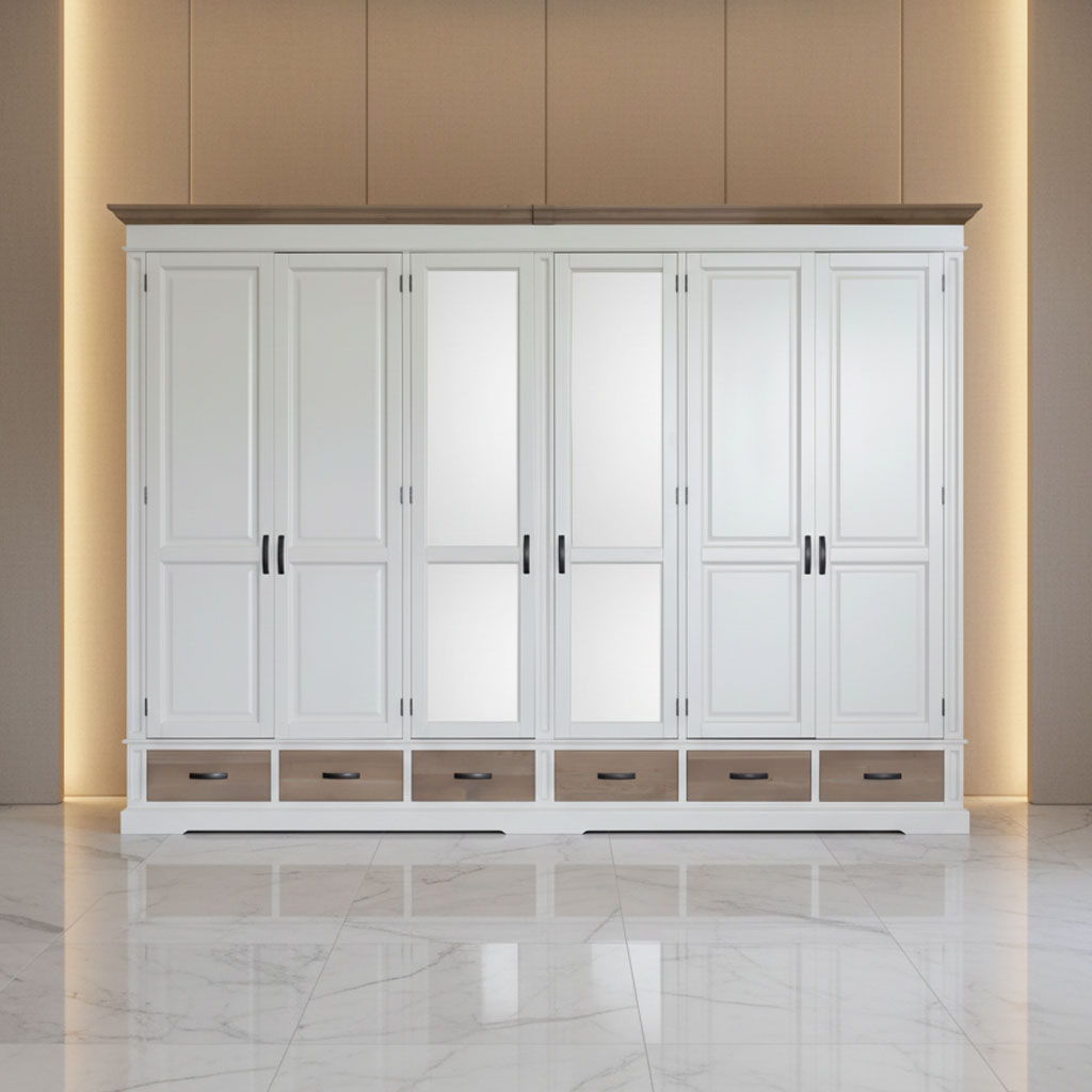Dulapul impresionează prin dimensiunea sa generoasă și liniile sale echilibrate, fiind ideal pentru dormitoare spațioase. Cele 6 uși creează o structură simetrică și armonioasă, în timp ce oglinzile centrale adaugă un plus de funcționalitate și eleganță.