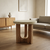 Blatul din travertin bej oferă o textură elegantă și un aspect sofisticat, în timp ce picioarele din stejar natur adaugă stabilitate și căldură vizuală.