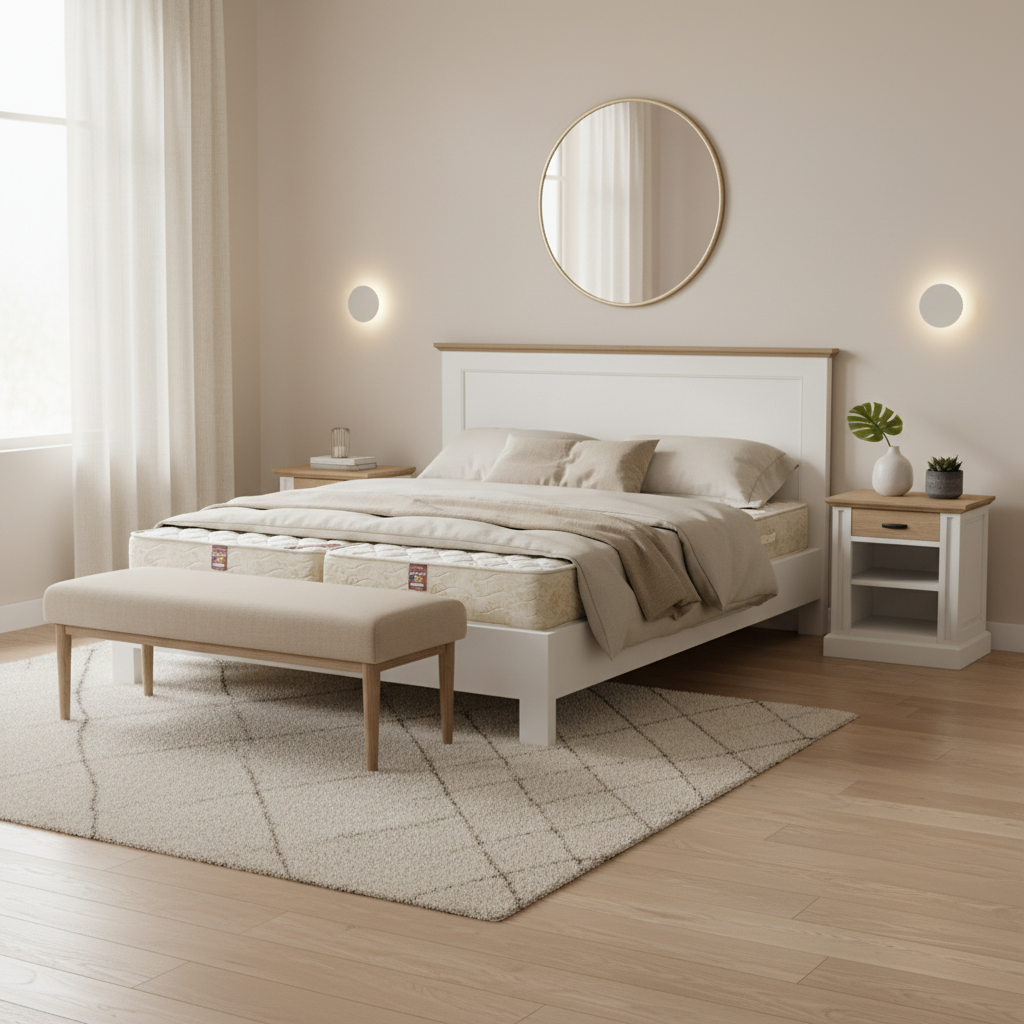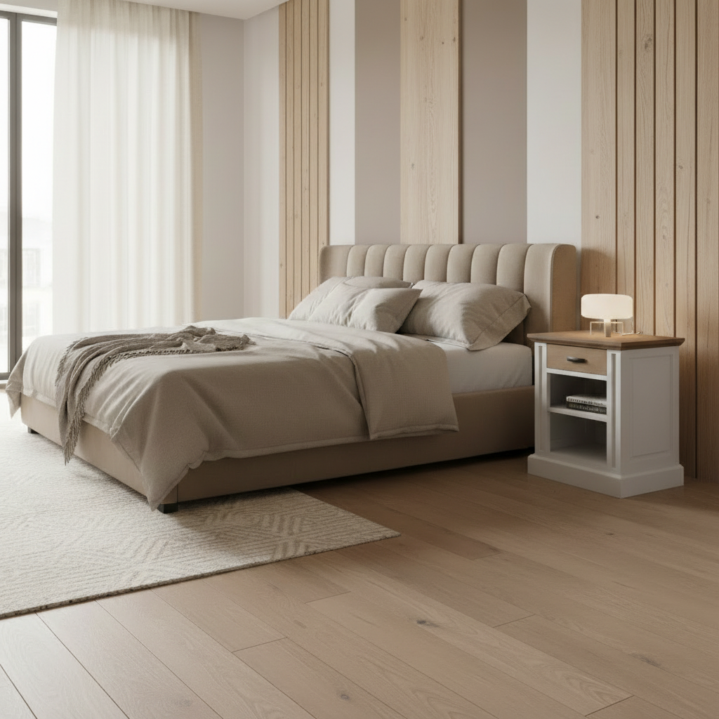Designul său farmhouse reinterpretat modern combină armonios alb luminos cu accente din lemn masiv de stejar natur, creând un contrast elegant, natural și cald, perfect pentru un ambient relaxant.