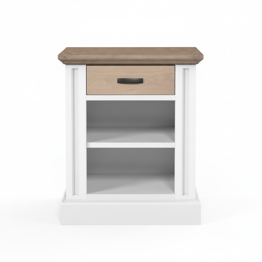 Noptiera Milano Collection, Transilvan, 1 Sertar, 2 Rafturi, MDF si Lemn Masiv, 51x44x66 cm, Alb si Stejar Natur