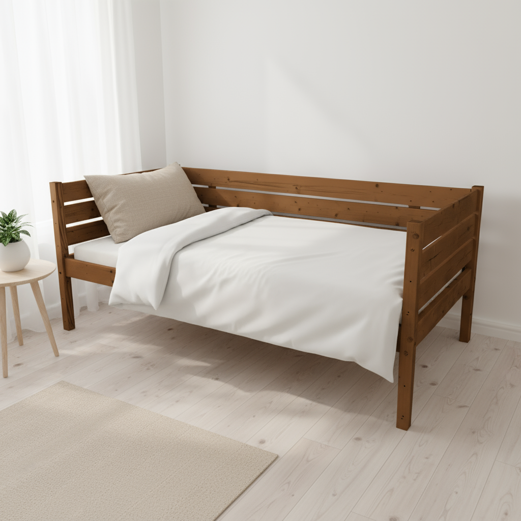 Pat de o persoana Sally Max, Transilvan, cu Protectie Laterala, Lemn Masiv, Model 4/4 Inaltat, 90x200 cm, Nuc