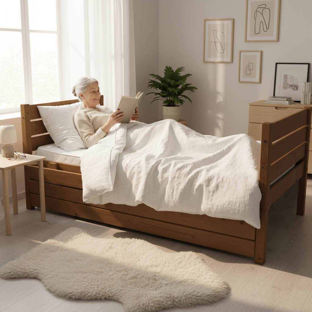 Patul este prevăzuta cu picioare înălțate pentru a facilita utilizarea de către persoanele în vârstă. Patul are, de asemenea, o parte rabatabilă care a fost concepută pentru siguranță. Sistemul de rabatare este ușor de utilizat, permițând ridicarea și coborârea secțiunii superioare fără efort.