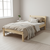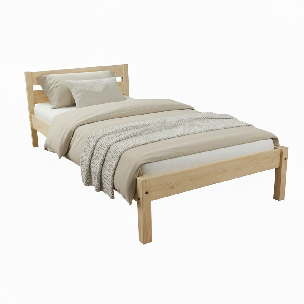 Patul de o persoană, cu culoarea naturală a lemnului și finisarea șlefuită, oferă un aspect elegant și organic, perfect pentru un dormitor modern și confortabil.