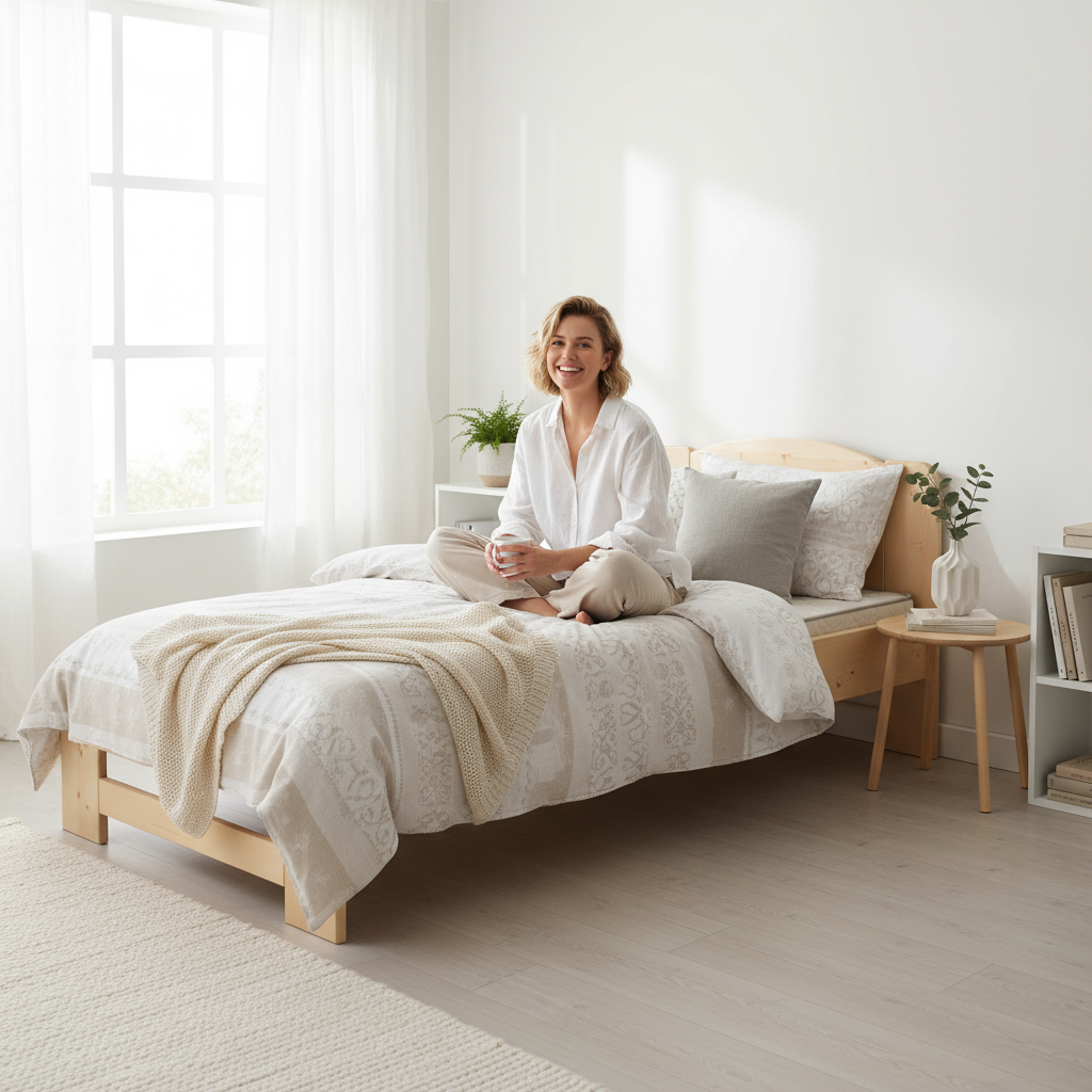 Acest model se evidențiază prin structura sa 3/1, având trei scânduri la tăblia din cap și o singură scândură la tăblia din picioare. Tăblia cap, cu o înălțime de 79 cm, oferă sprijin confortabil și completează designul armonios, în timp ce tăblia de la picioare, cu o înălțime de 40 cm, menține o linie discretă. Înălțimea șezutului este de 40 cm, ideală pentru confortul zilnic.