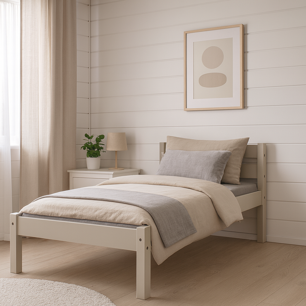 Patul este realizat din lemn masiv de molid 100%, certificat FSC, garantând durabilitatea și respectul pentru mediul înconjurător. Acest material de înaltă calitate asigură o rezistență de lungă durată și o stabilitate excelentă, făcând din acest pat o investiție pe termen lung.