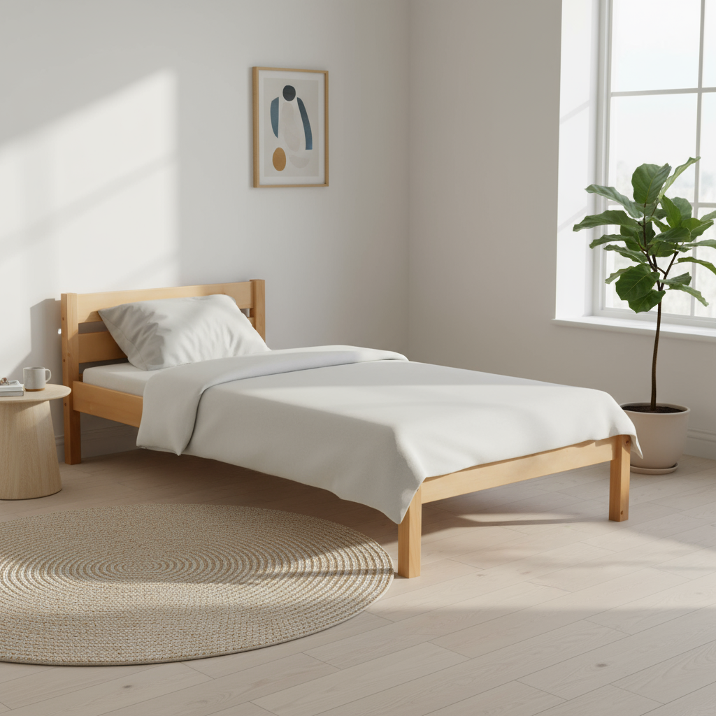 Patul cu culoare naturală se integrează perfect în orice spațiu, aducând o senzație de prospețime în dormitor.