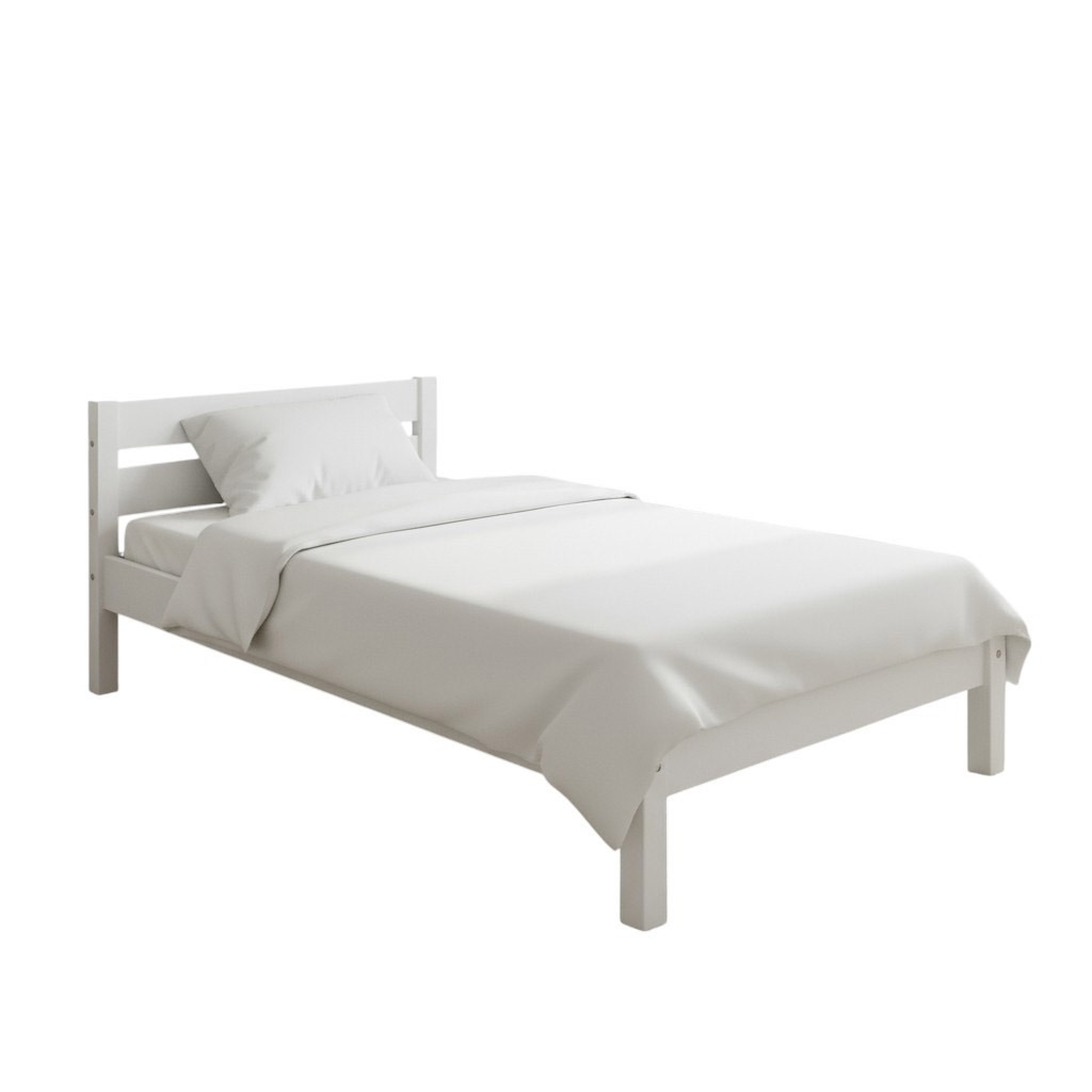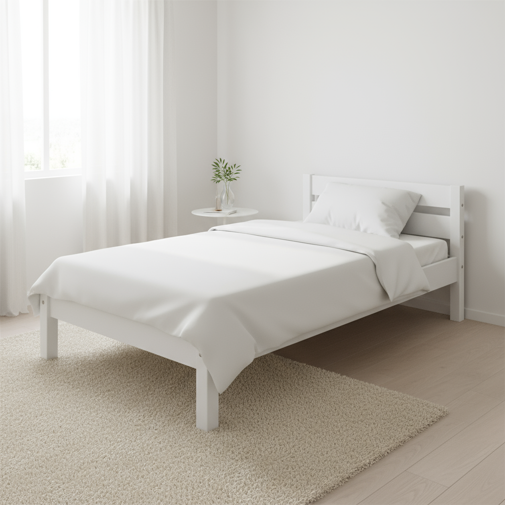 Patul de culoare albă oferă un design simplu și elegant, potrivit pentru orice decor de dormitor.