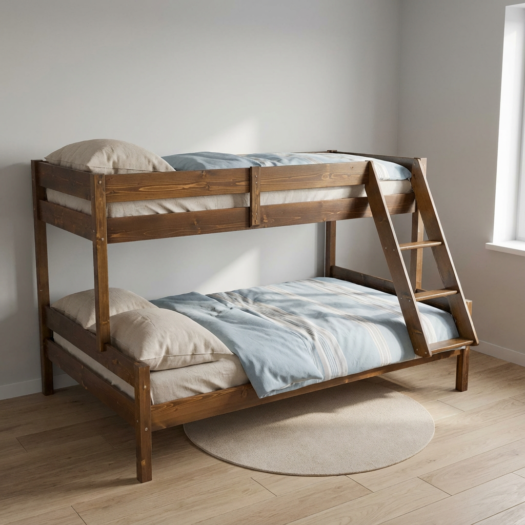 Cu bucurie și entuziasm vă prezentăm patul etajat Sandra pentru familiile unite. Acest pat etajat îmbină cu armonie confortul cu funcționalitatea, oferind un loc de visare pentru cei mici alături de părinții lor. Patul etajat din lemn masiv pentru 3 persoane este alegerea perfectă pentru familiile moderne în căutarea confortului, siguranței și eleganței.