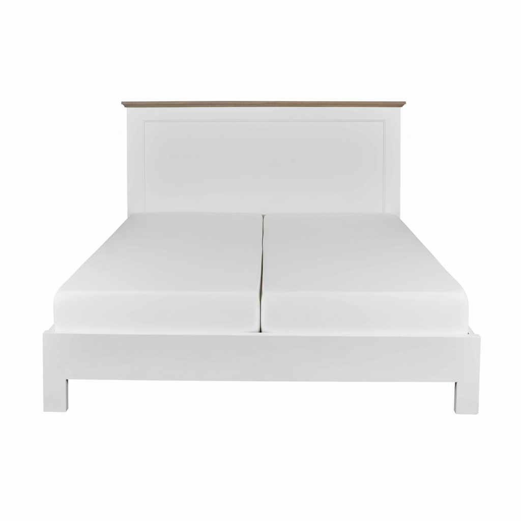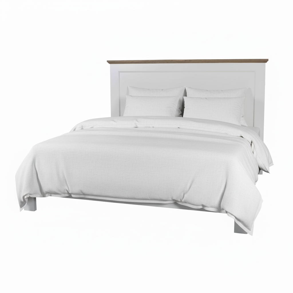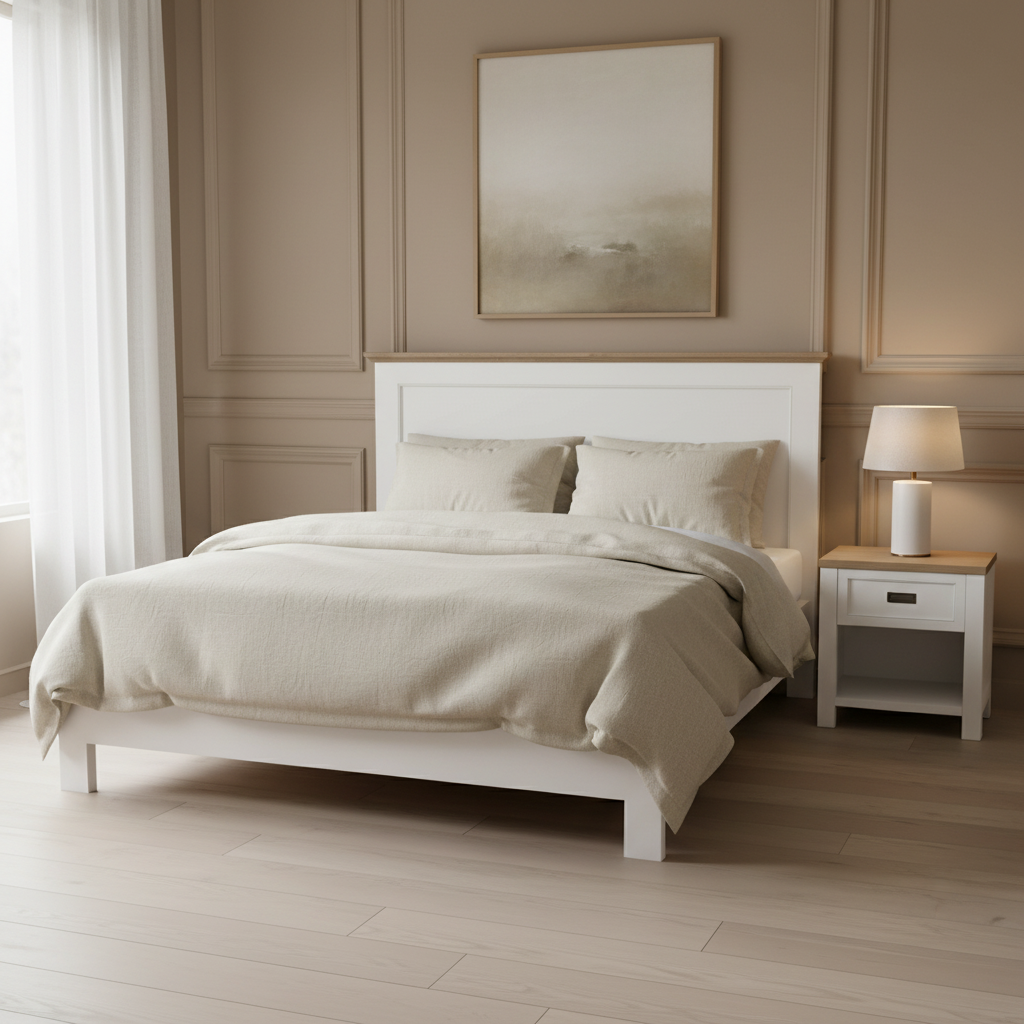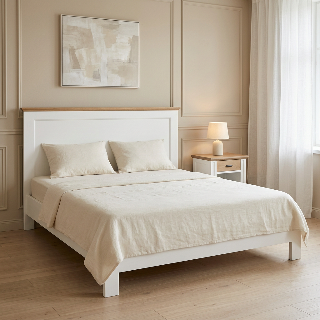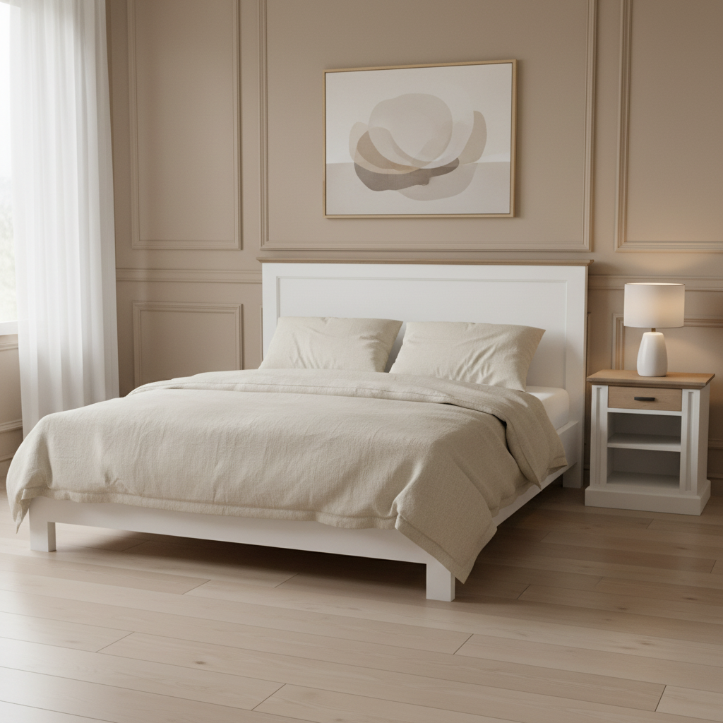 Designul său clasic reinterpretat modern îmbină armonios alb luminos cu accente din lemn masiv de stejar natur, creând o atmosferă caldă, relaxantă și rafinată, perfectă pentru un spațiu dedicat odihnei.