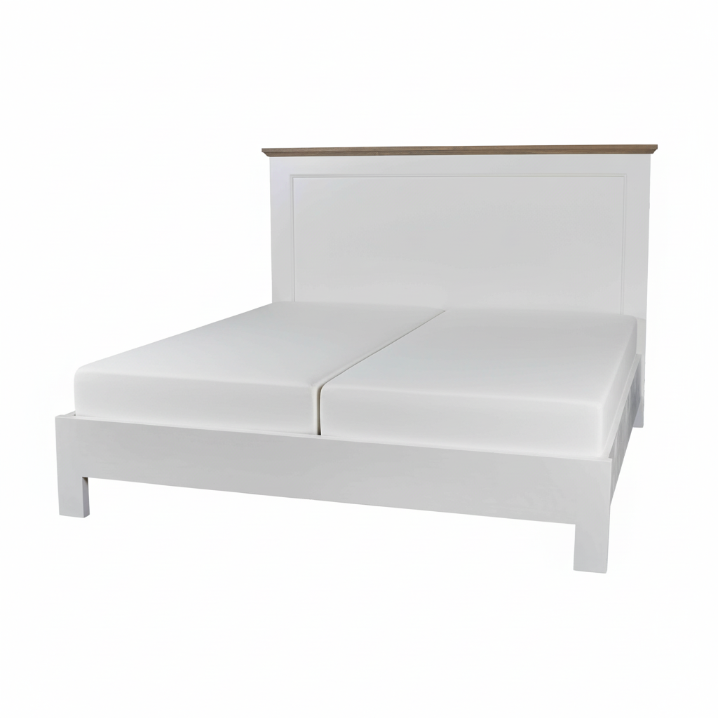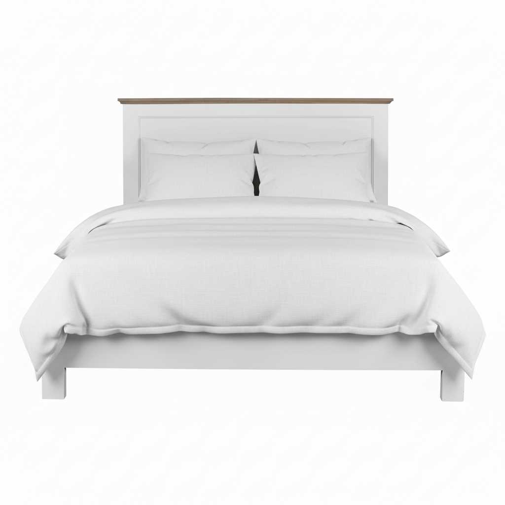 Patul impresionează prin proporțiile sale echilibrate și liniile curate, fiind o piesă centrală în orice dormitor. Finisajul alb conferă luminozitate și senzație de spațiu, în timp ce elementele din lemn natur adaugă căldură și autenticitate.