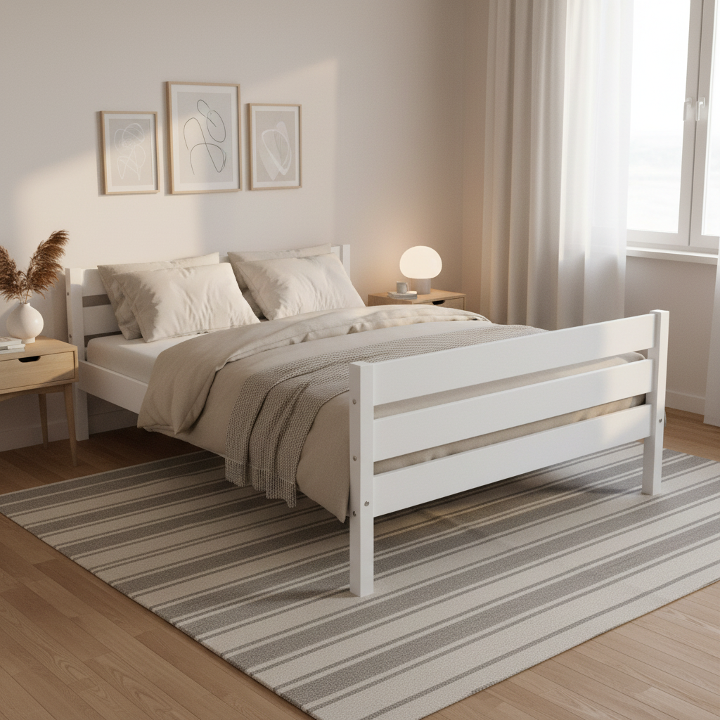 Patul este realizat din lemn masiv de molid 100%, certificat FSC, garantând durabilitatea și respectul pentru mediul înconjurător. Acest material de înaltă calitate asigură o rezistență de lungă durată și o stabilitate excelentă, făcând din acest pat o investiție pe termen lung.
