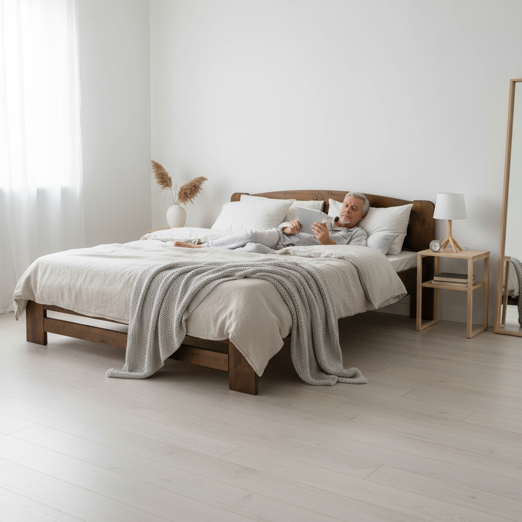 Acest model se evidențiază prin structura sa 3/1, având trei scânduri la tăblia din cap și o singură scândură la tăblia din picioare. Tăblia cap, cu o înălțime de 79 cm, oferă sprijin confortabil și completează designul armonios, în timp ce tăblia de la picioare, cu o înălțime de 40 cm, menține o linie discretă. Înălțimea șezutului este de 40 cm, ideală pentru confortul zilnic.