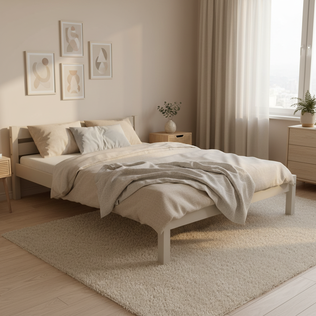 Patul este realizat din lemn masiv de molid 100%, certificat FSC, garantând durabilitatea și respectul pentru mediul înconjurător. Acest material de înaltă calitate asigură o rezistență de lungă durată și o stabilitate excelentă, făcând din acest pat o investiție pe termen lung.