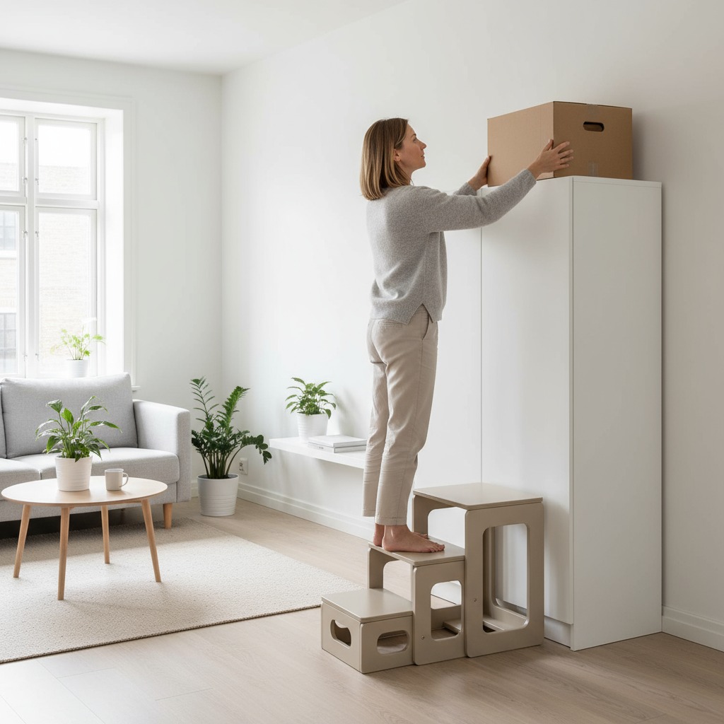 Scaunul Scara Tommy este ajutorul perfect în orice locuință. Te ajută să ajungi cu ușurință la rafturile înalte din bucătărie, la dulapurile de sus din dressing sau la polițele din living, fără a fi nevoie de scări voluminoase. Este ideal și pentru curățenie, când ai nevoie să ștergi praful de pe mobilierul înalt sau să schimbi o perdea. În plus, atunci când este folosit ca scaun, devine o piesă suplimentară de mobilier, perfectă pentru oaspeți sau momentele petrecute în familie.