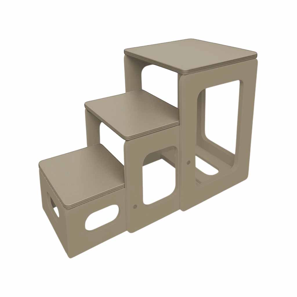 Produsul este fabricat din lemn masiv stratificat, durabil și rezistent în timp. Finisajul este realizat cu vopsea pe bază de apă, non-toxică, prietenoasă cu mediul și sigură pentru copii. Liniile sunt fine, iar colțurile sunt rotunjite pentru o utilizare fără riscuri. Sistemele de fixare și elementele anti-alunecare garantează siguranță maximă, atât în poziția de scaun, cât și în cea de scară.