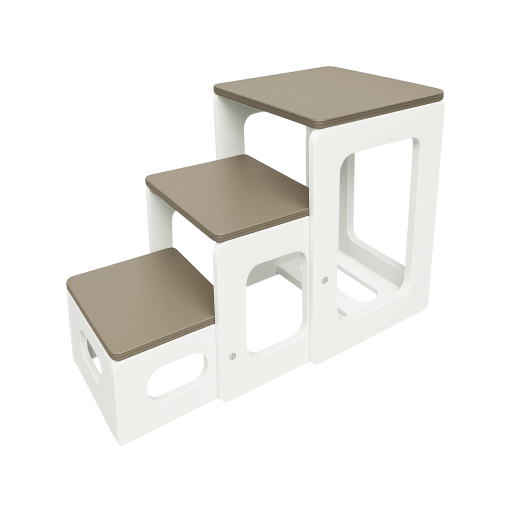 Produsul este fabricat din lemn masiv stratificat, durabil și rezistent în timp. Finisajul este realizat cu vopsea pe bază de apă, non-toxică, prietenoasă cu mediul și sigură pentru copii. Liniile sunt fine, iar colțurile sunt rotunjite pentru o utilizare fără riscuri. Sistemele de fixare și elementele anti-alunecare garantează siguranță maximă, atât în poziția de scaun, cât și în cea de scară.