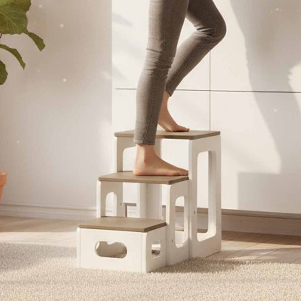 Scaunul Scara Tommy este ajutorul perfect în orice locuință. Te ajută să ajungi cu ușurință la rafturile înalte din bucătărie, la dulapurile de sus din dressing sau la polițele din living, fără a fi nevoie de scări voluminoase. Este ideal și pentru curățenie, când ai nevoie să ștergi praful de pe mobilierul înalt sau să schimbi o perdea. În plus, atunci când este folosit ca scaun, devine o piesă suplimentară de mobilier, perfectă pentru oaspeți sau momentele petrecute în familie.