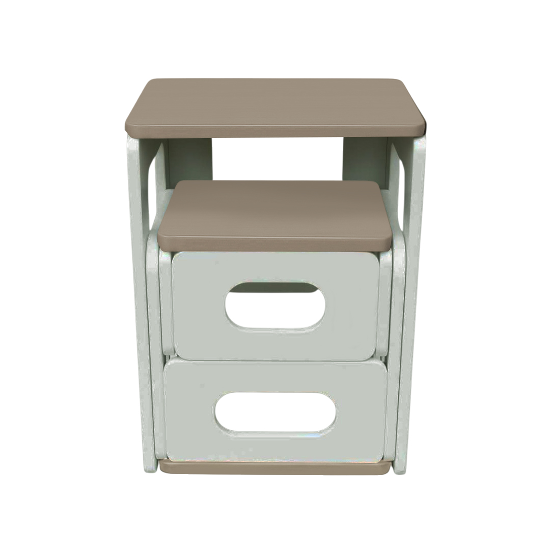 Produsul este fabricat din lemn masiv stratificat, durabil și rezistent în timp. Finisajul este realizat cu vopsea pe bază de apă, non-toxică, prietenoasă cu mediul și sigură pentru copii. Liniile sunt fine, iar colțurile sunt rotunjite pentru o utilizare fără riscuri. Sistemele de fixare și elementele anti-alunecare garantează siguranță maximă, atât în poziția de scaun, cât și în cea de scară.