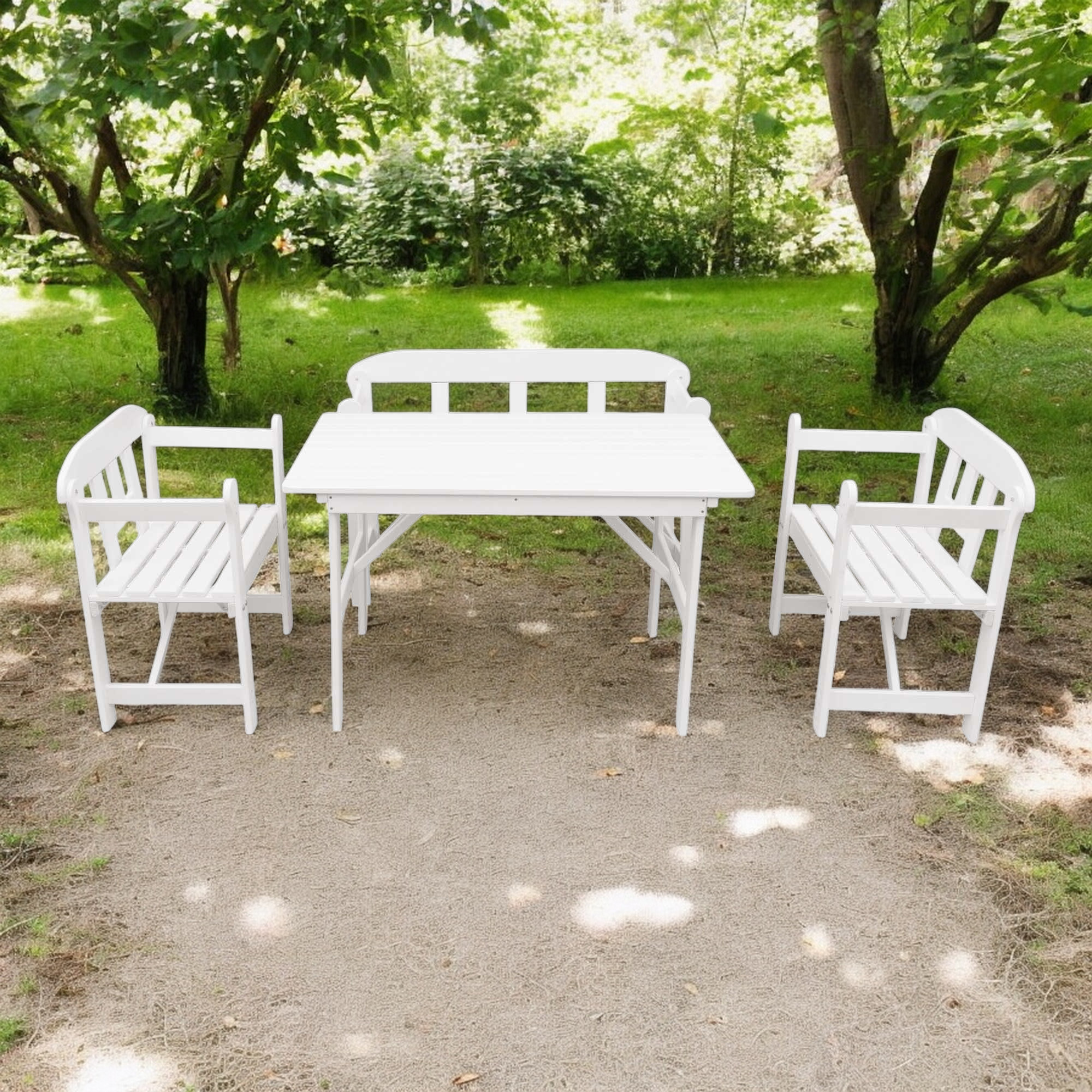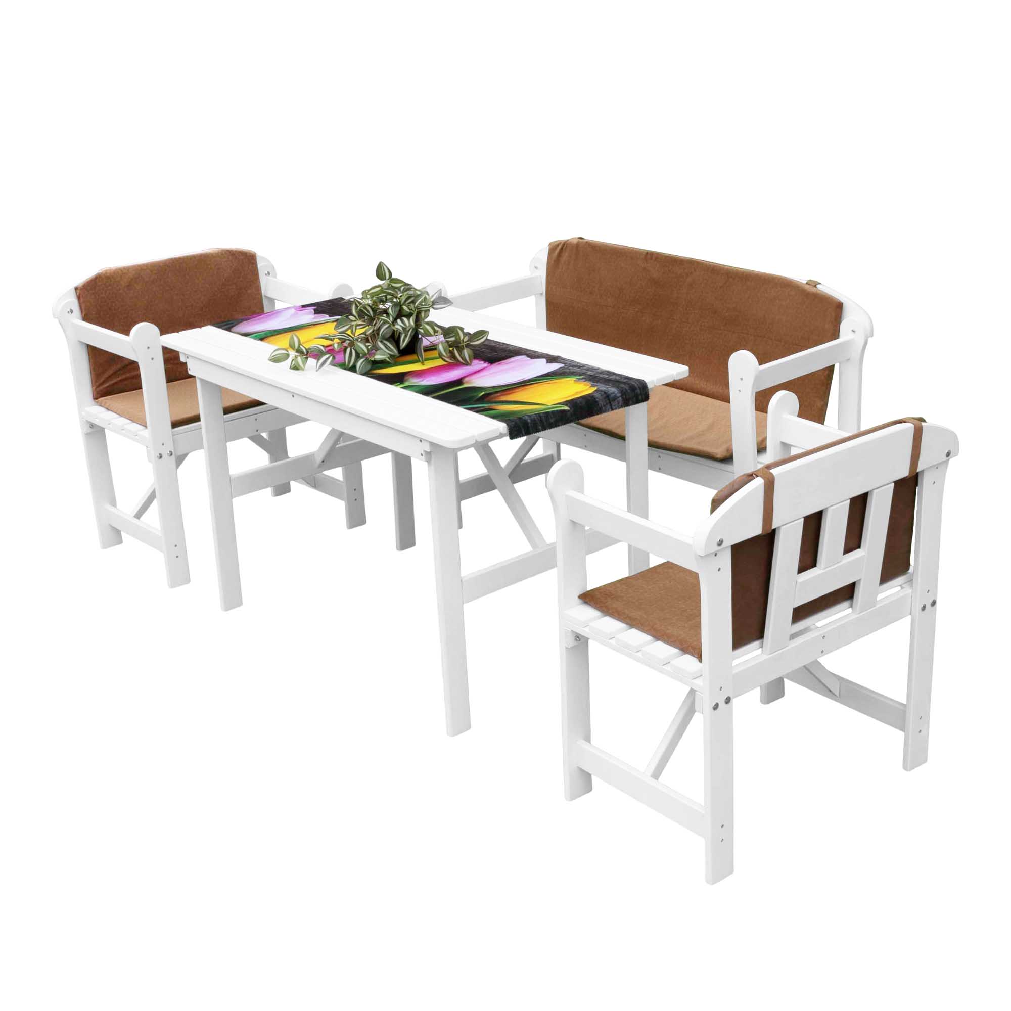 Set Mobilier Gradina Emy, Masa, 3 Banci, 4 Persoane, Perne Maro Incluse, Transilvan, Lemn Masiv, 120x70 cm, Alb